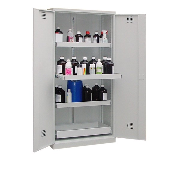 - Bac de rétention en acier au bas de l'armoire hauteur 80 mm, monté sur rails coulissants.