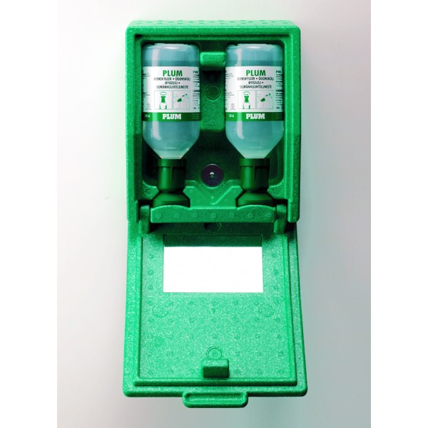 Corps en polyéthylène. Fourni avec système de fixation murale. Ouverture manuelle par rabat de la palette centrale. Fourni avec 2 flacons de solution saline pour le rinçage des yeux contaminés par un corps étranger (poussières)
