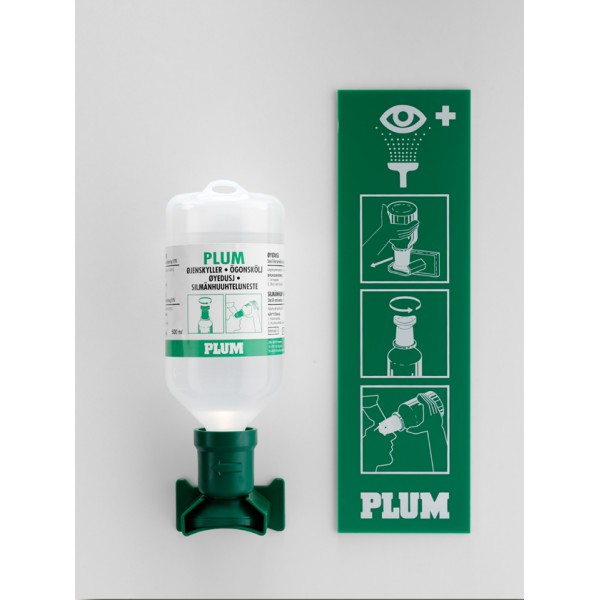 Corps en polyéthylène. Fourni avec système de fixation murale. Fourni avec 1 flacon de solution saline pour le rinçage des yeux contaminés par un corps étranger (poussières)