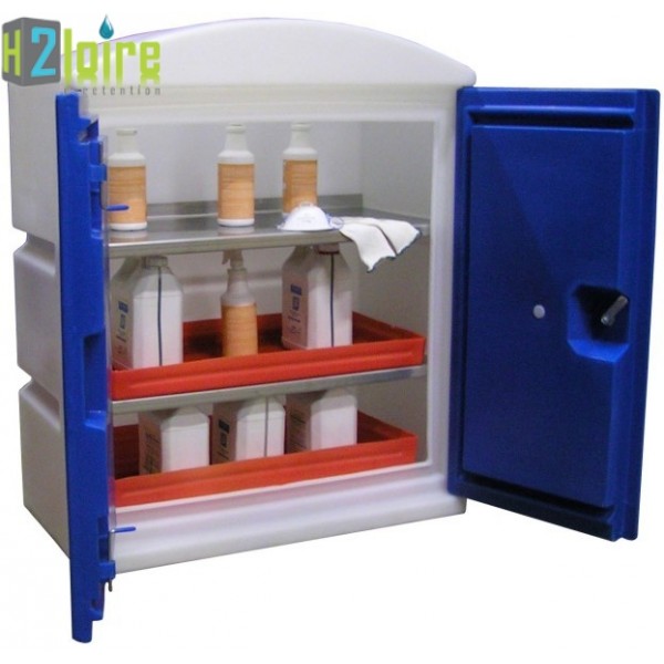 Equipée de 2 étagères inox amovibles - 2 portes battantes sur charnières inox fermées à clé - livrée montée. Adapté au stockage interne de flacons de produits corrosifs.