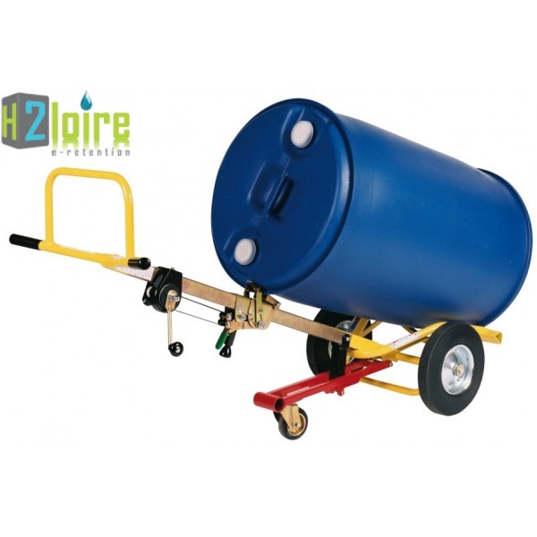 Charge admissible : 350 kg - Hauteur de prise de fûts mini : 700 mm maxi : 1080 mm. Pince auto-serreuse. Ø des roues 300 mm. Treuil de levage pour monter et descendre des fûts métalliques et plastiques de palettes. Béquille équipée d'un amortisseur de descente du fût.