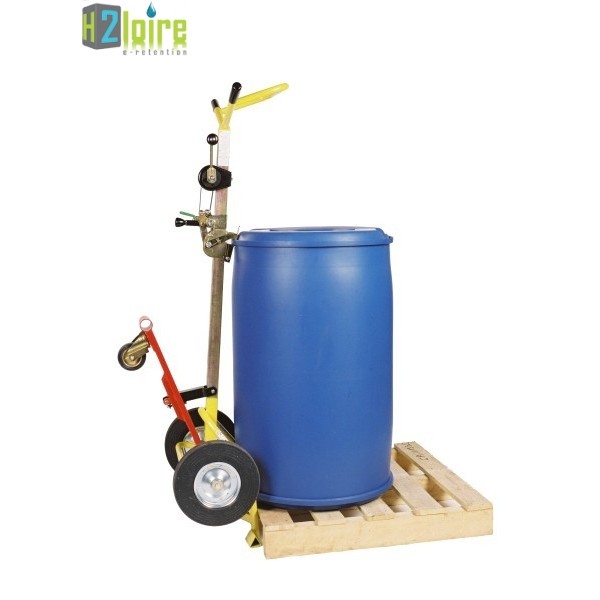 Diable avec treuil de levage intégré pour dépalettiser des fûts.