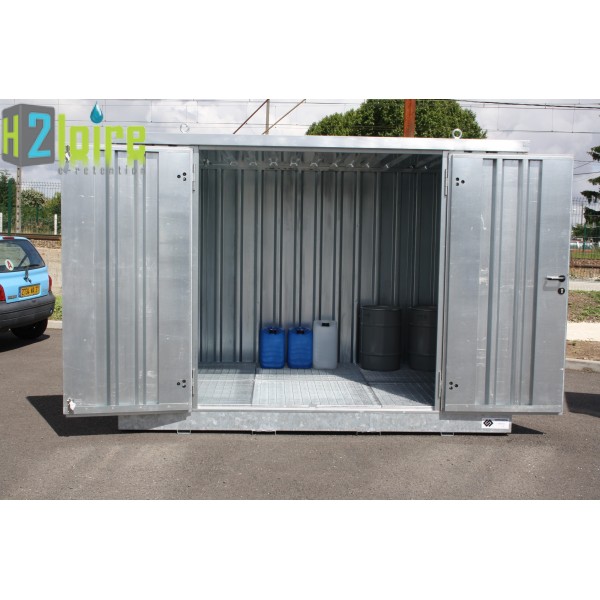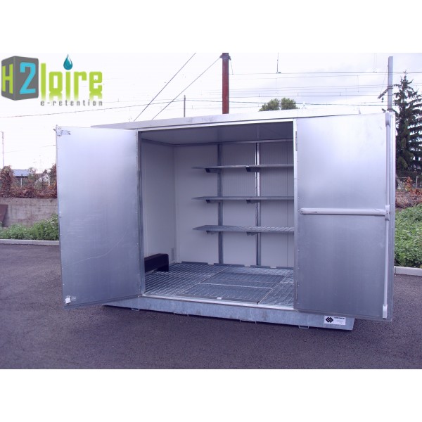 MODELE AVEC FOURREAUX : Entrepôt de stockage tôlée avec rétention de 727 litres pour le stockage de bidons et flacons de produits chimiques.