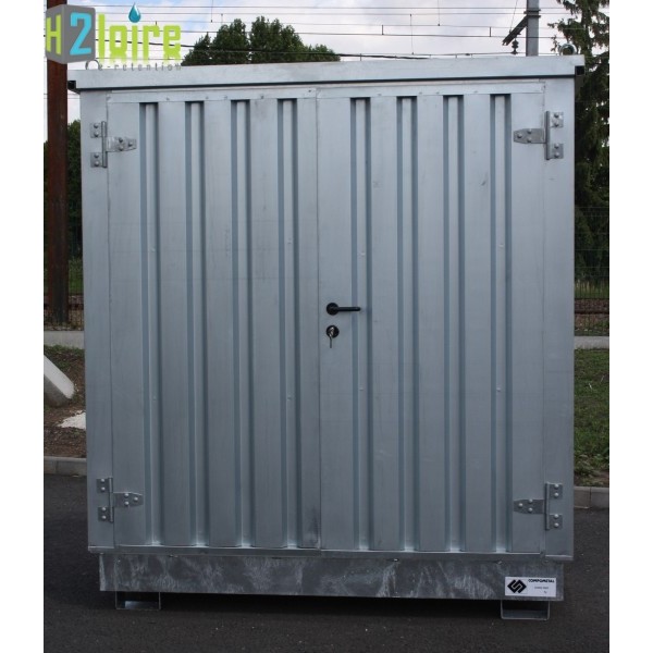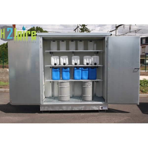 MODELE AVEC FOURREAUX : conteneur de stockage tôlée avec rétention de 350 litres pour le stockage de bidons et flacons de produits phytosanitaires.