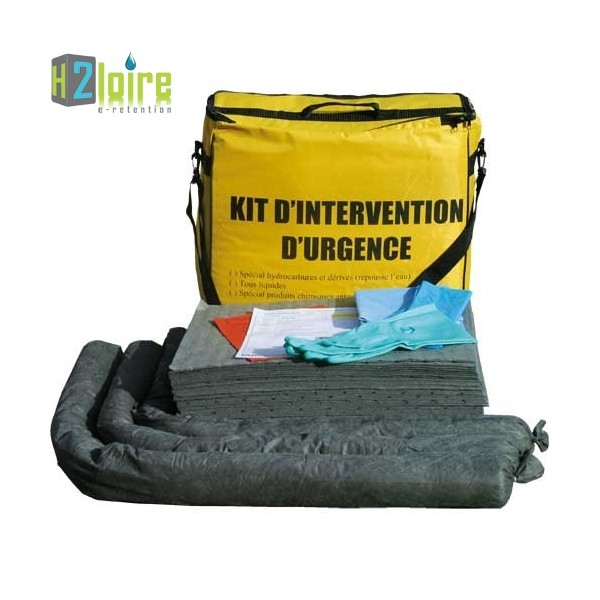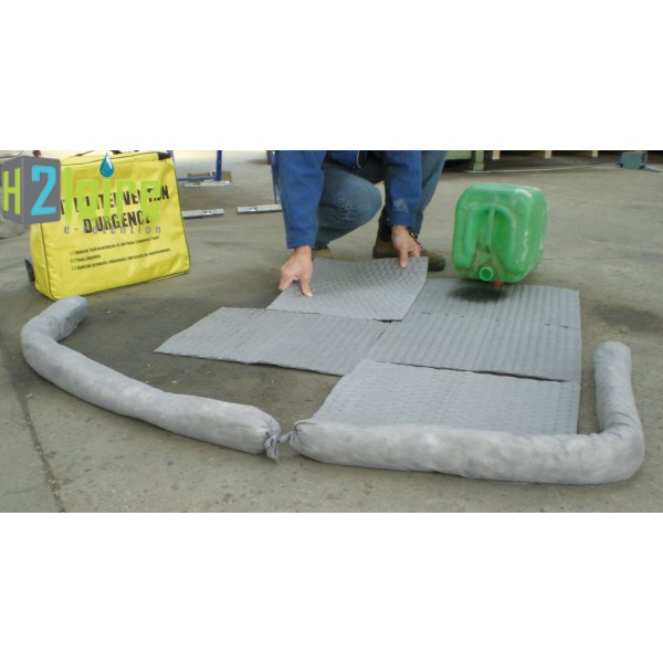 1 sac de transport nylon - 50 feuilles 46 x 41 cm - 4 boudins Ø 7,6 x 122 cm - 4 coussins 25 x 25 cm - 1 paire de gants - 10 essuyeurs - 1 paire de lunettes de protection - 2 sacs de récupération