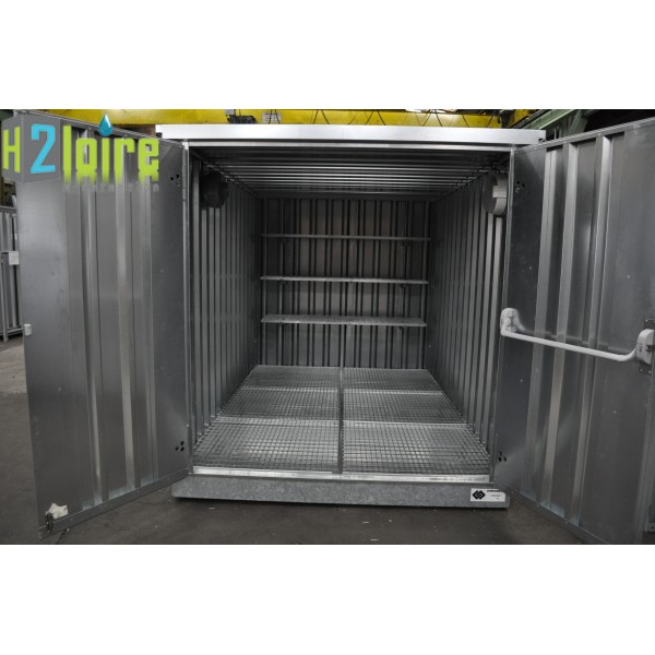 Entrepôt de stockage double, tôlée avec rétention de 1720 litres - Porte battante 2 vantaux avec poignée et serrure (ouverture largeur 1790 mm) sur la façade de 3060 mm - FINITION ACIER GALVANISE